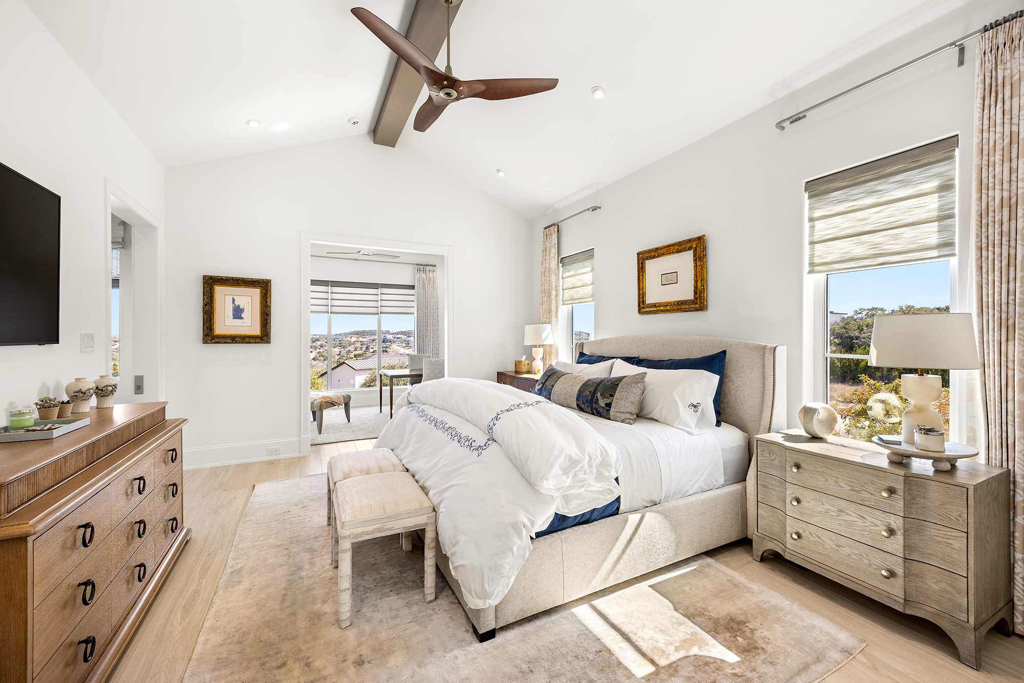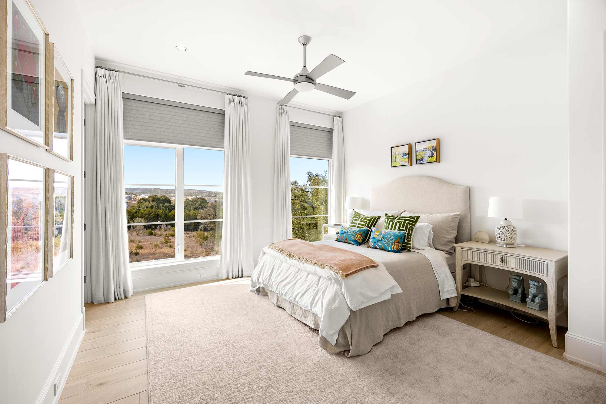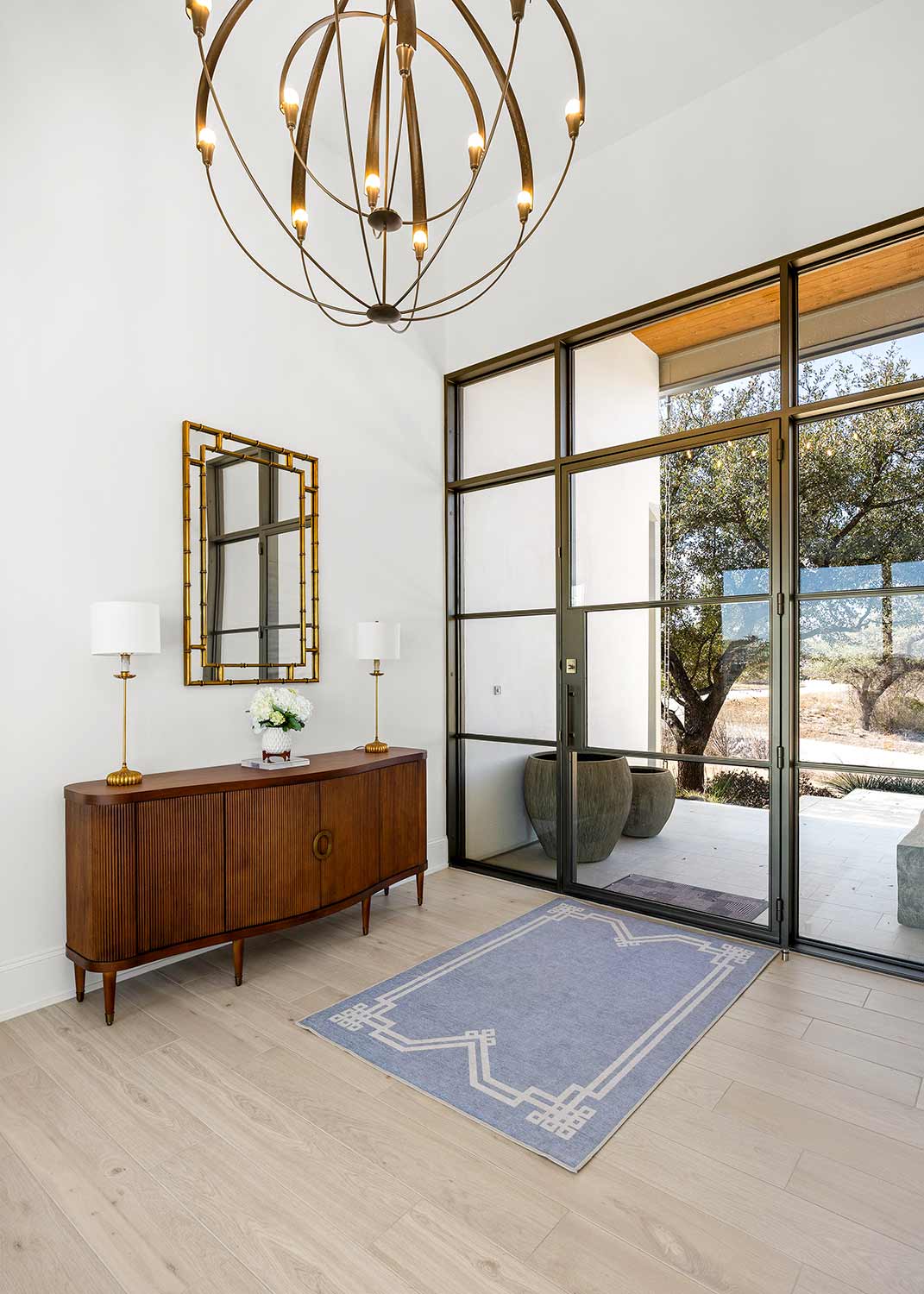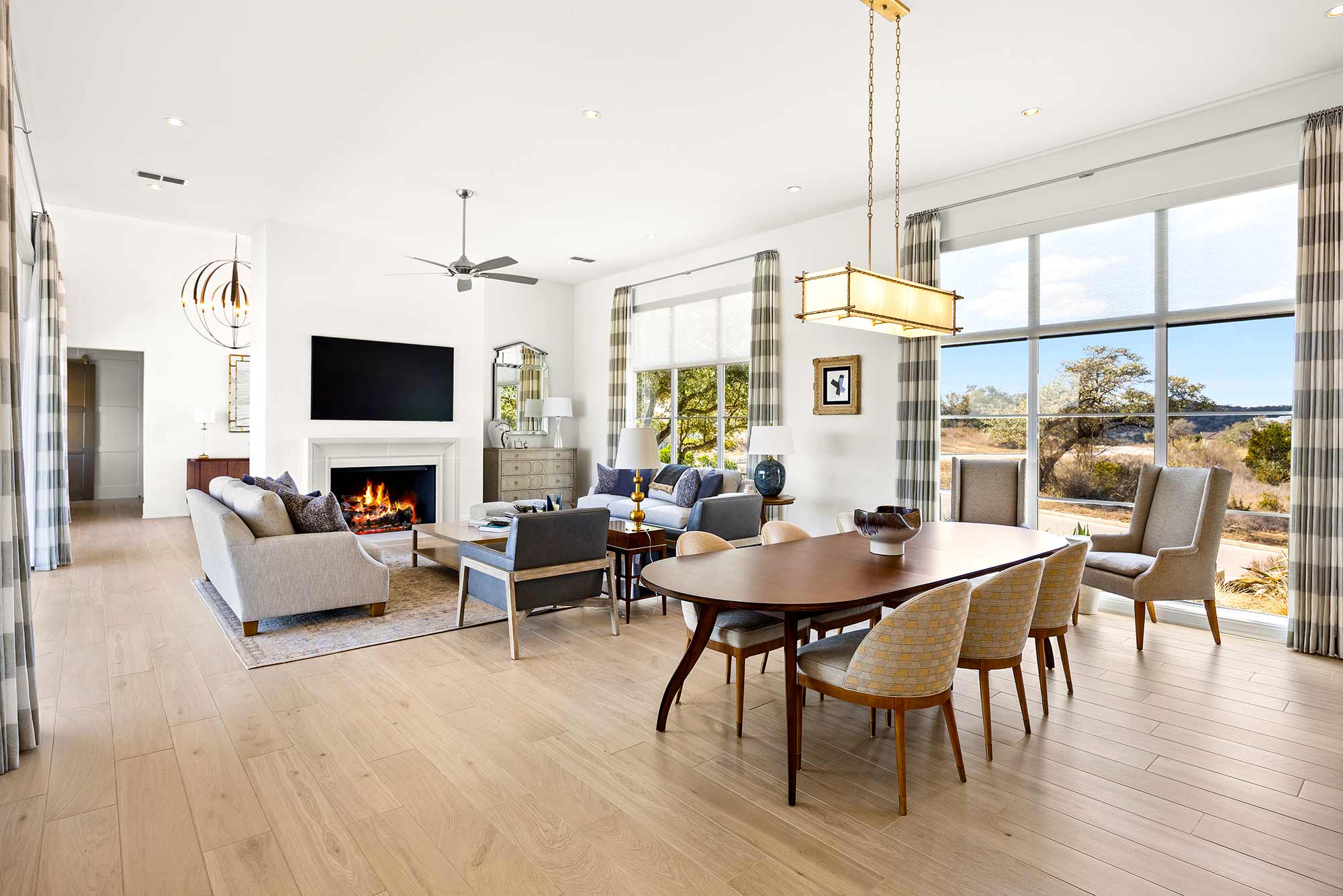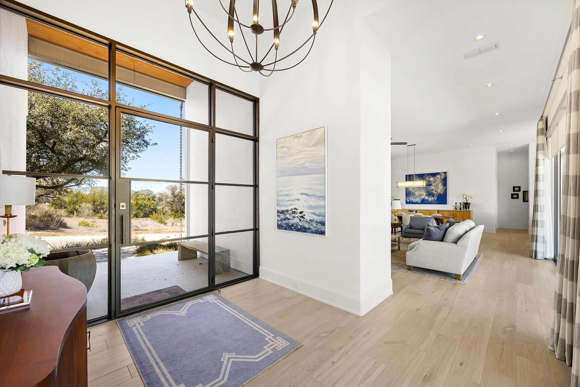 - Bright open spaces enhanced by light wall treatments, light wood floors and oversized windows