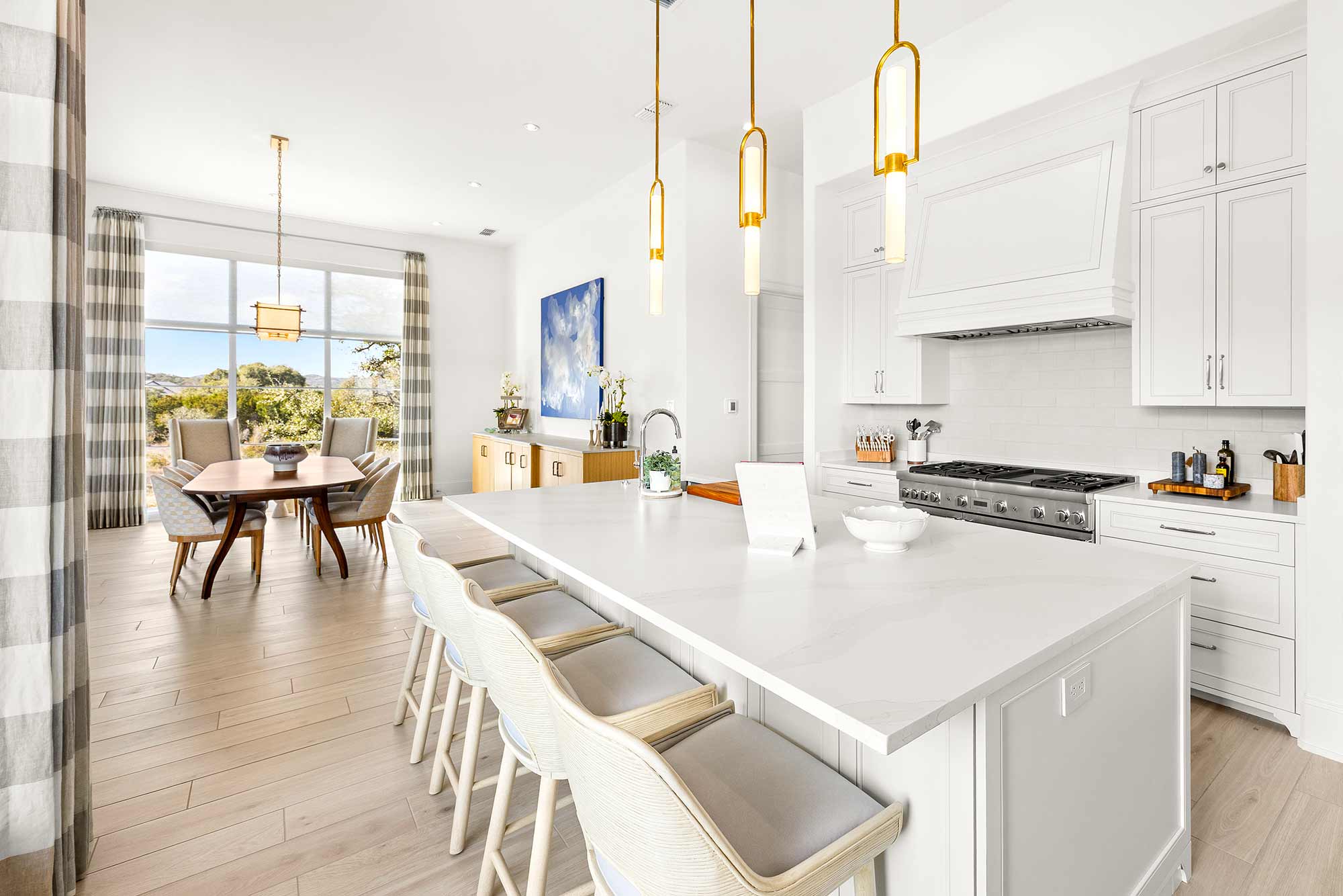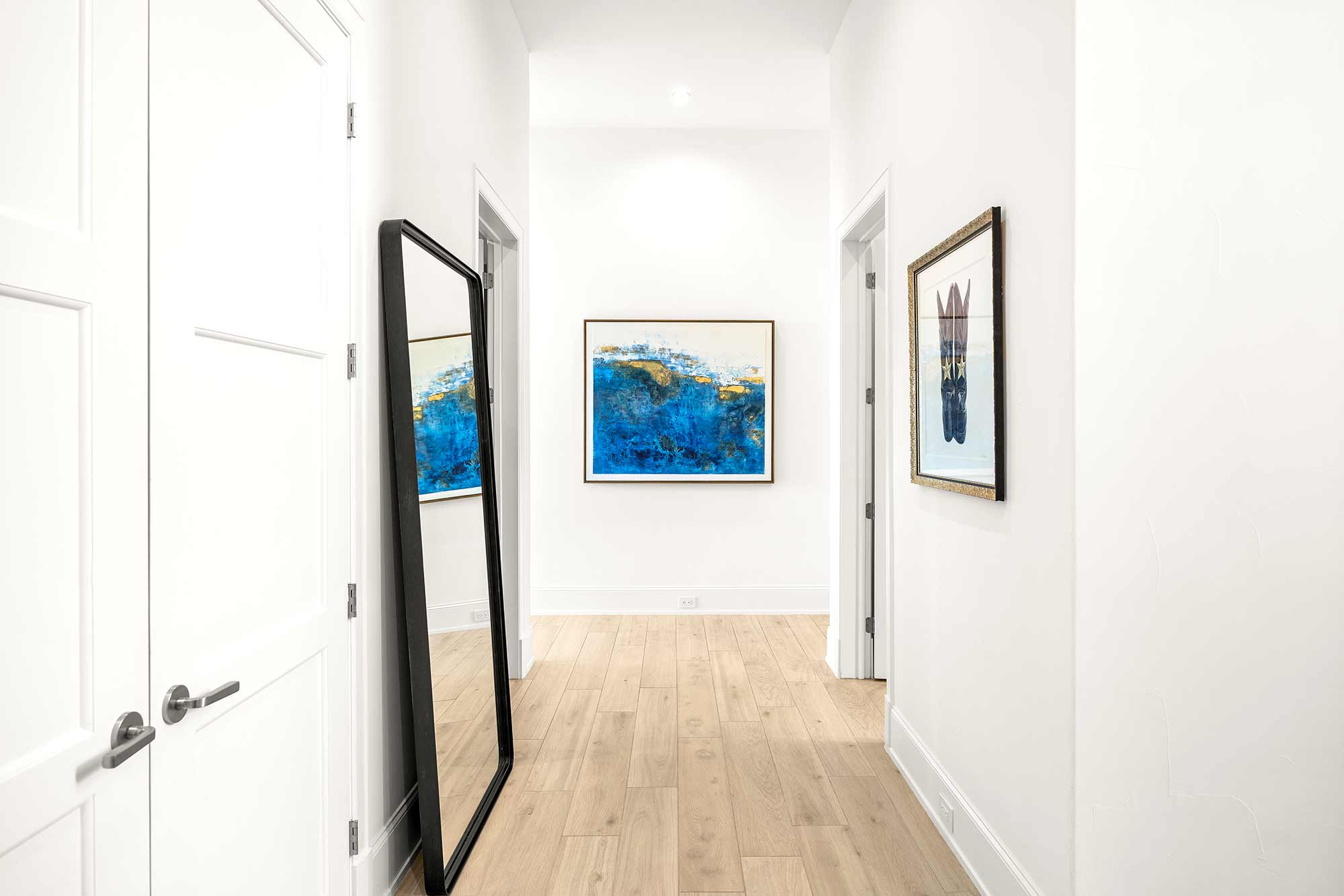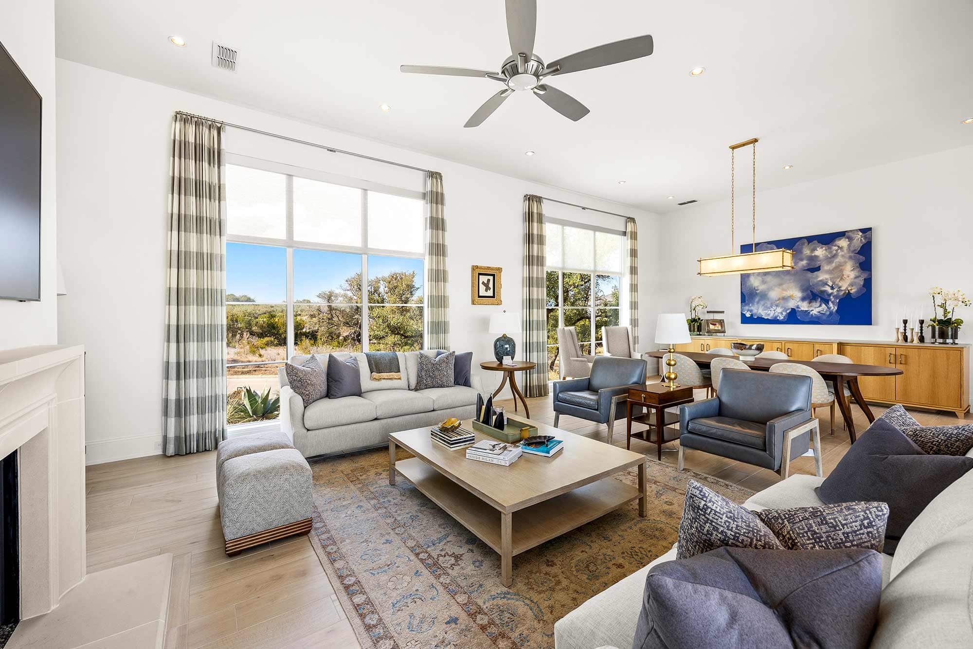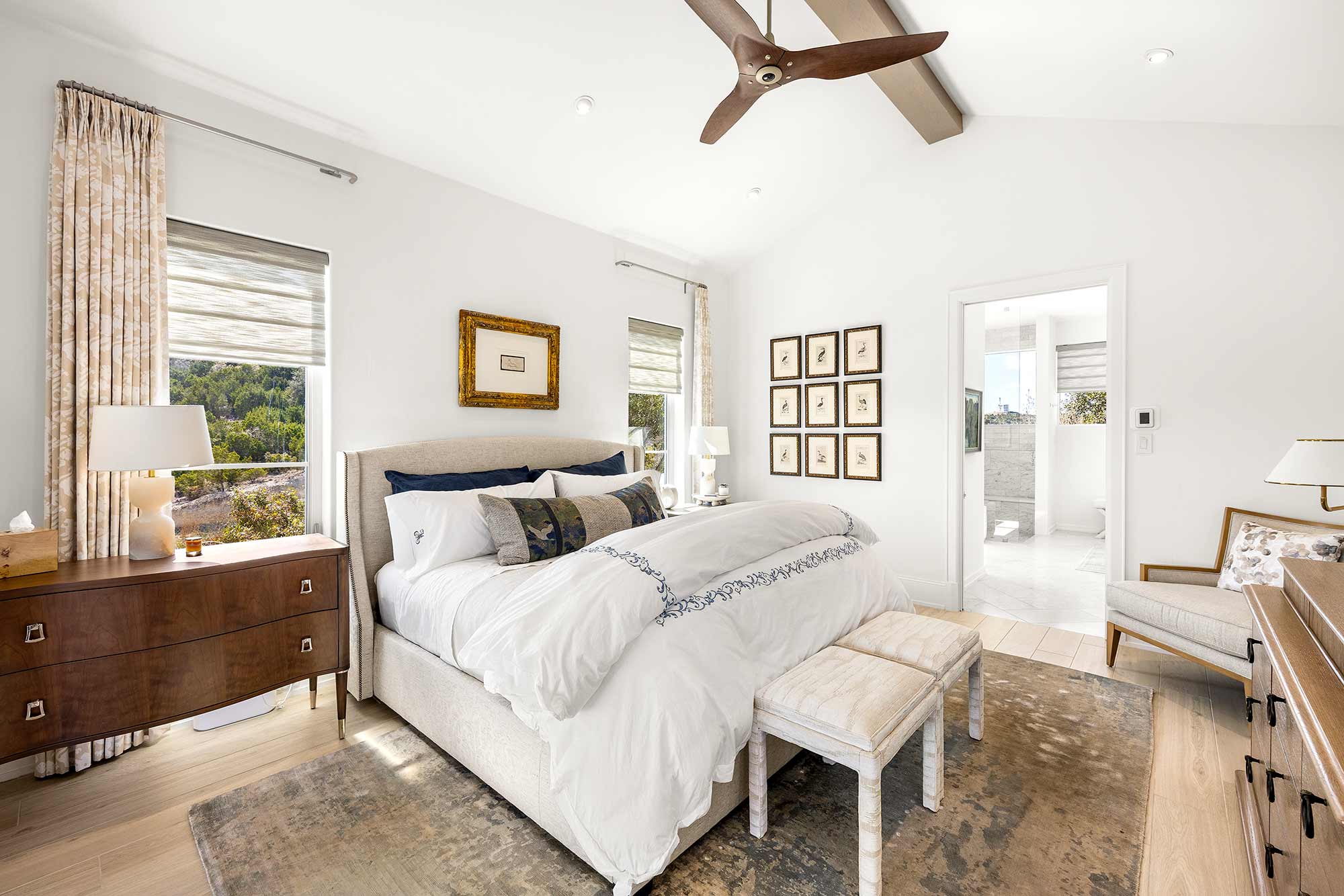 - Bright open spaces enhanced by light wall treatments, light wood floors and oversized windows