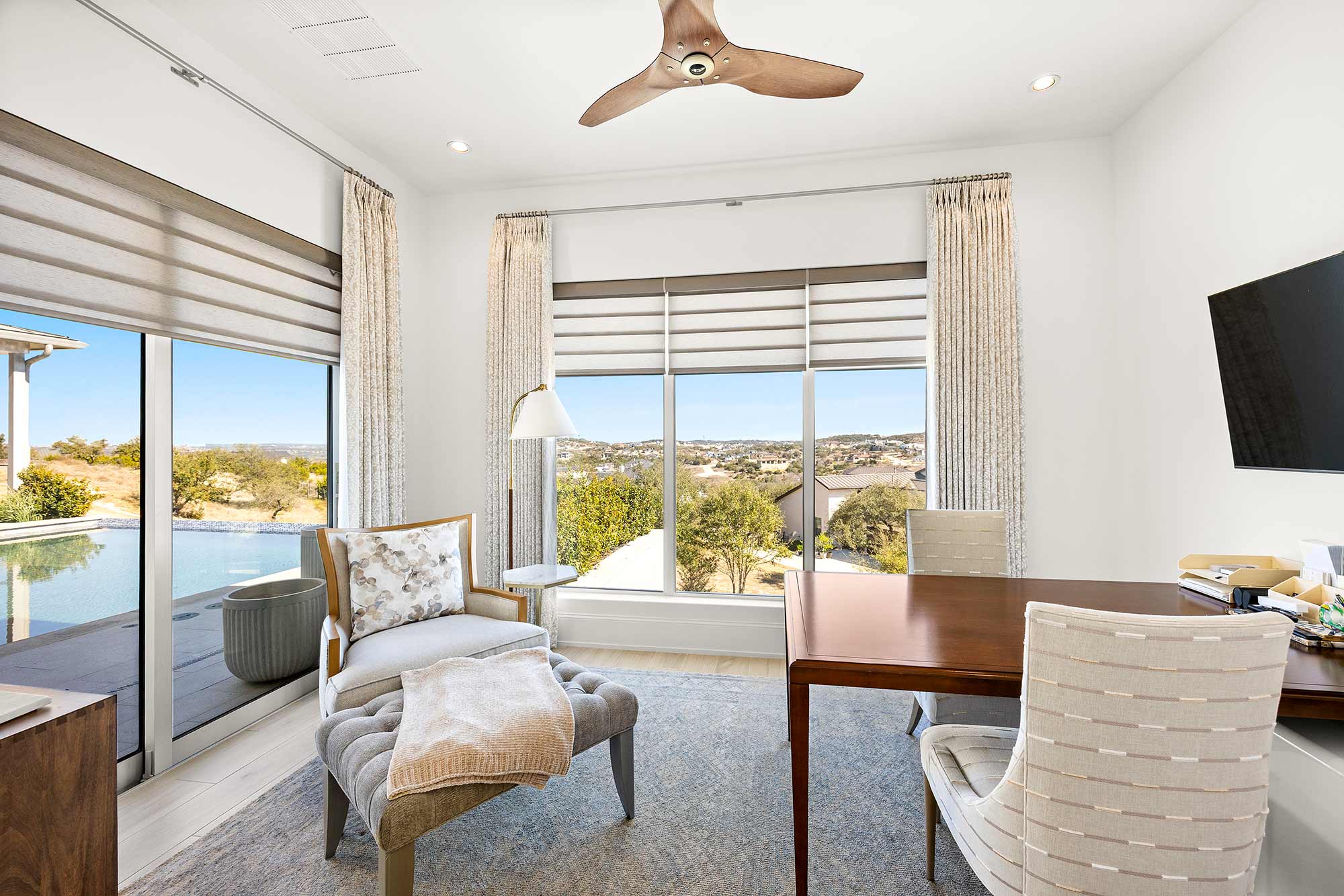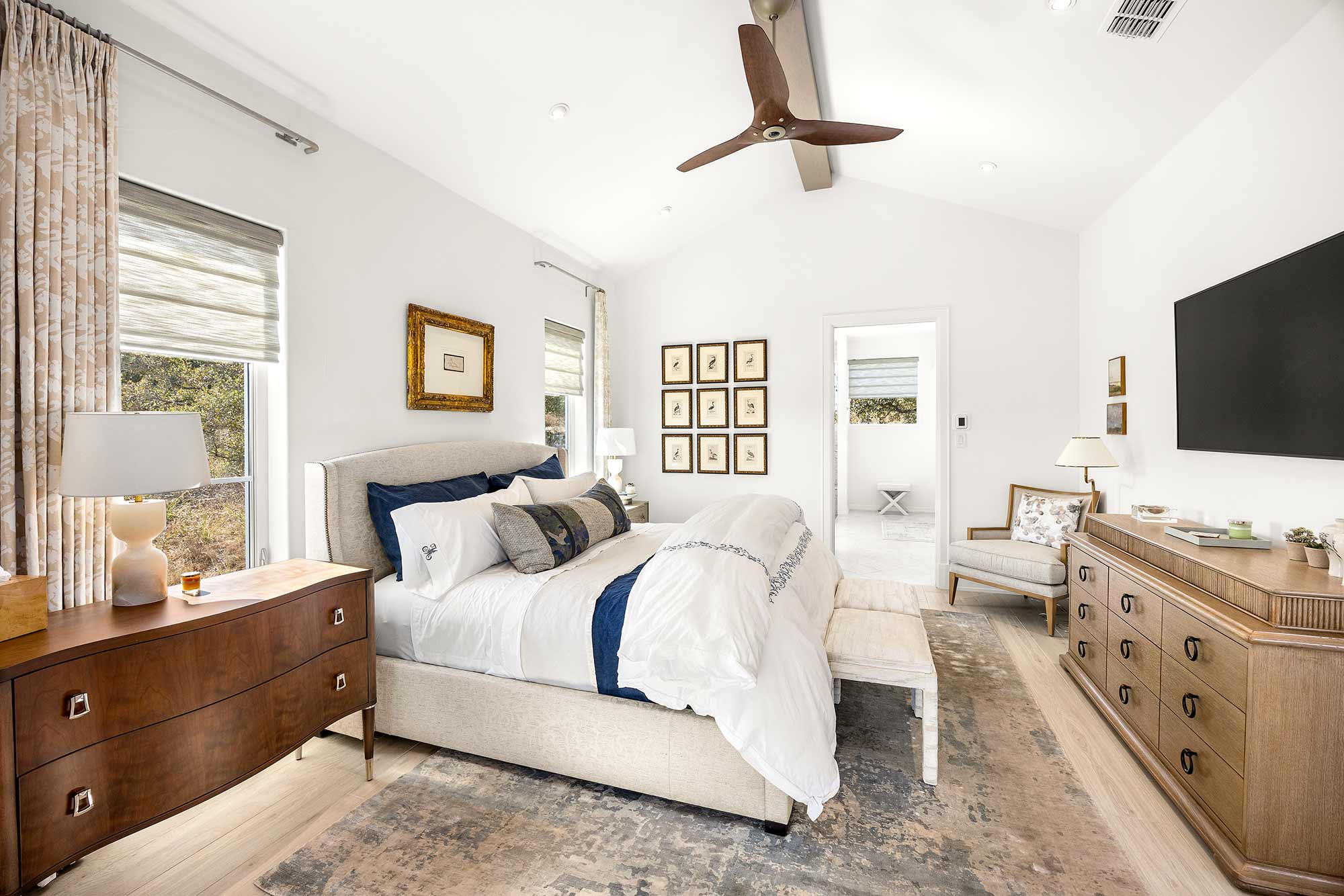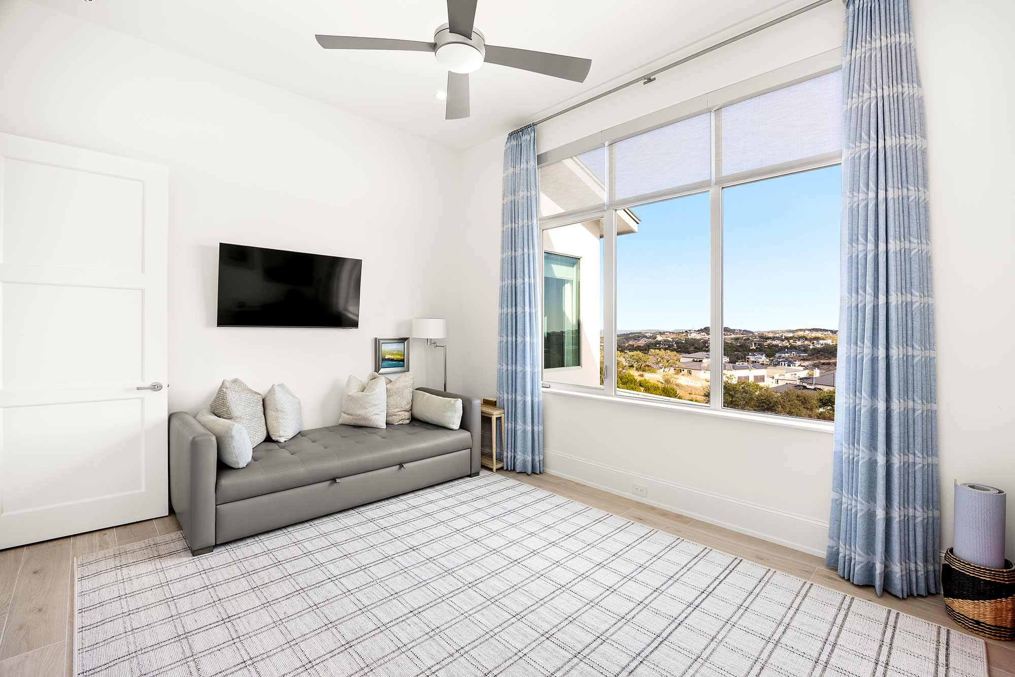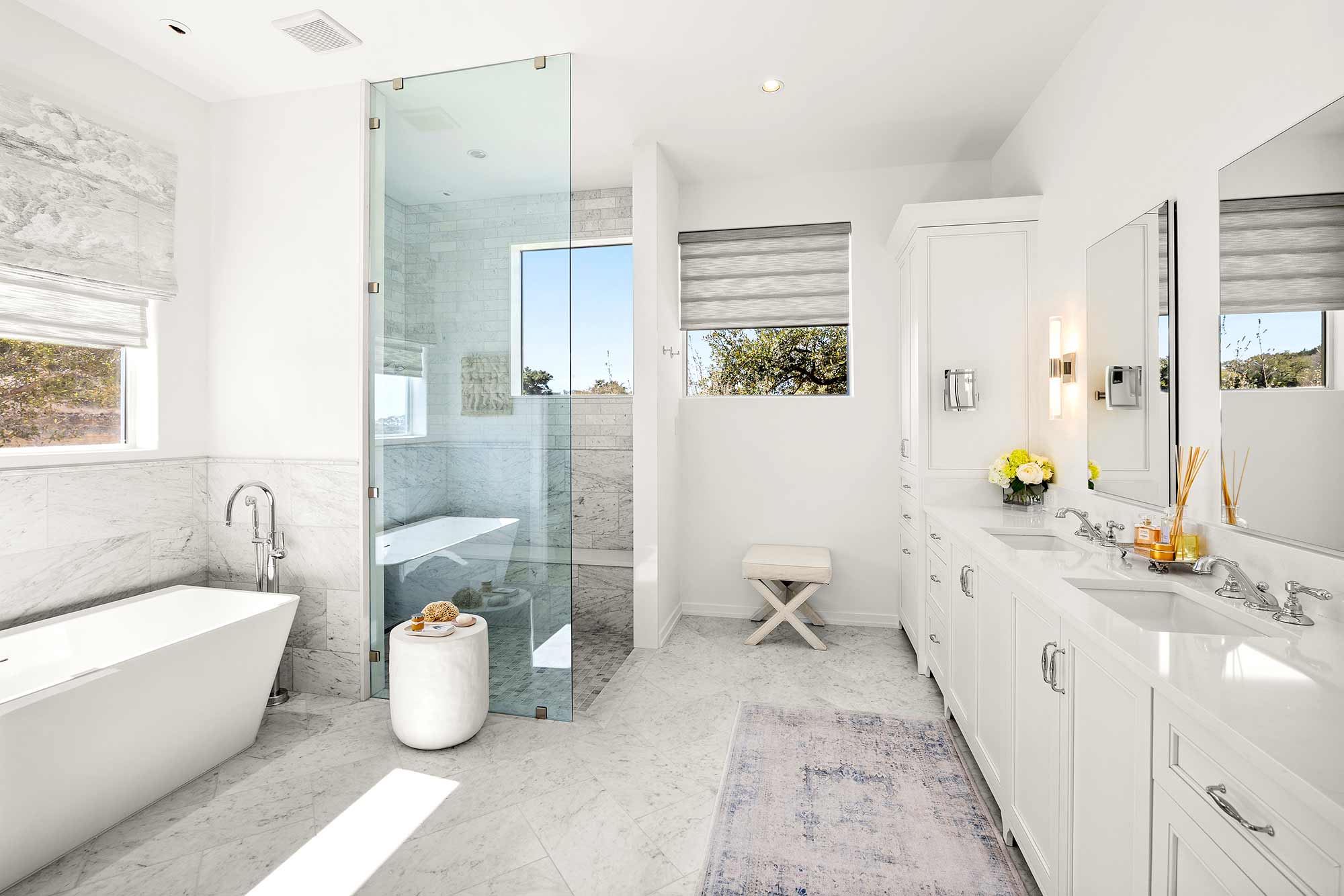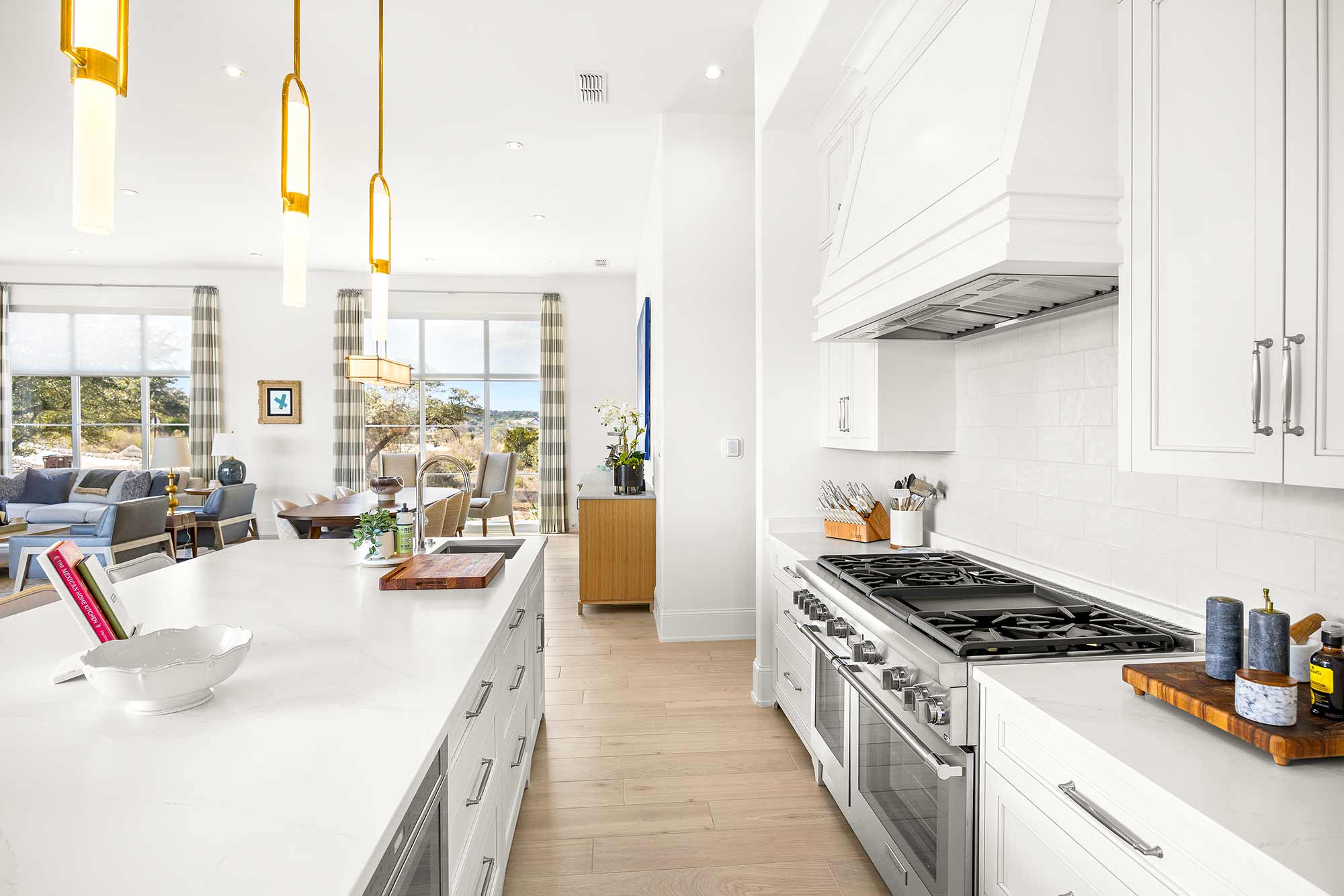 - Bright open spaces enhanced by light wall treatments, light wood floors and oversized windows
