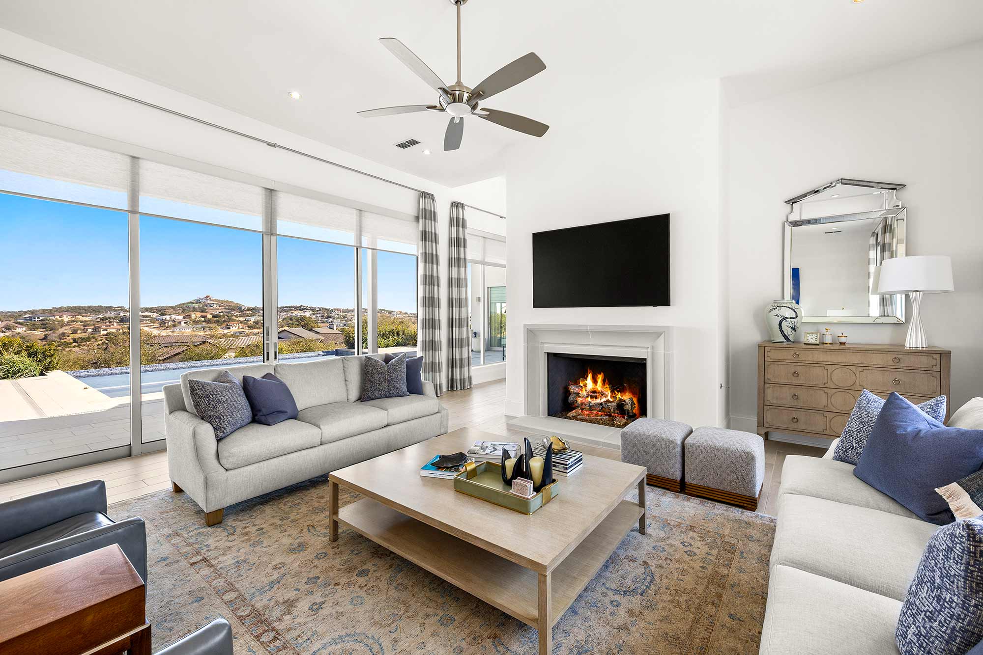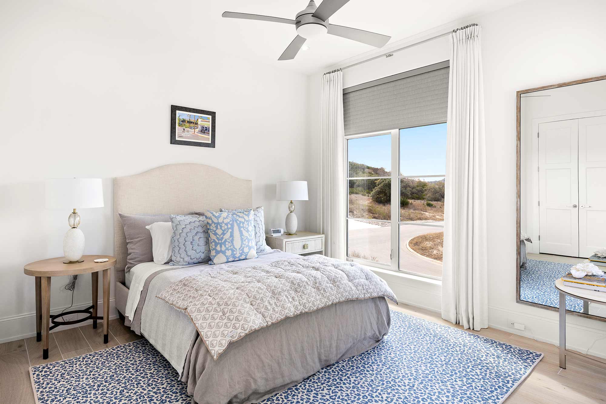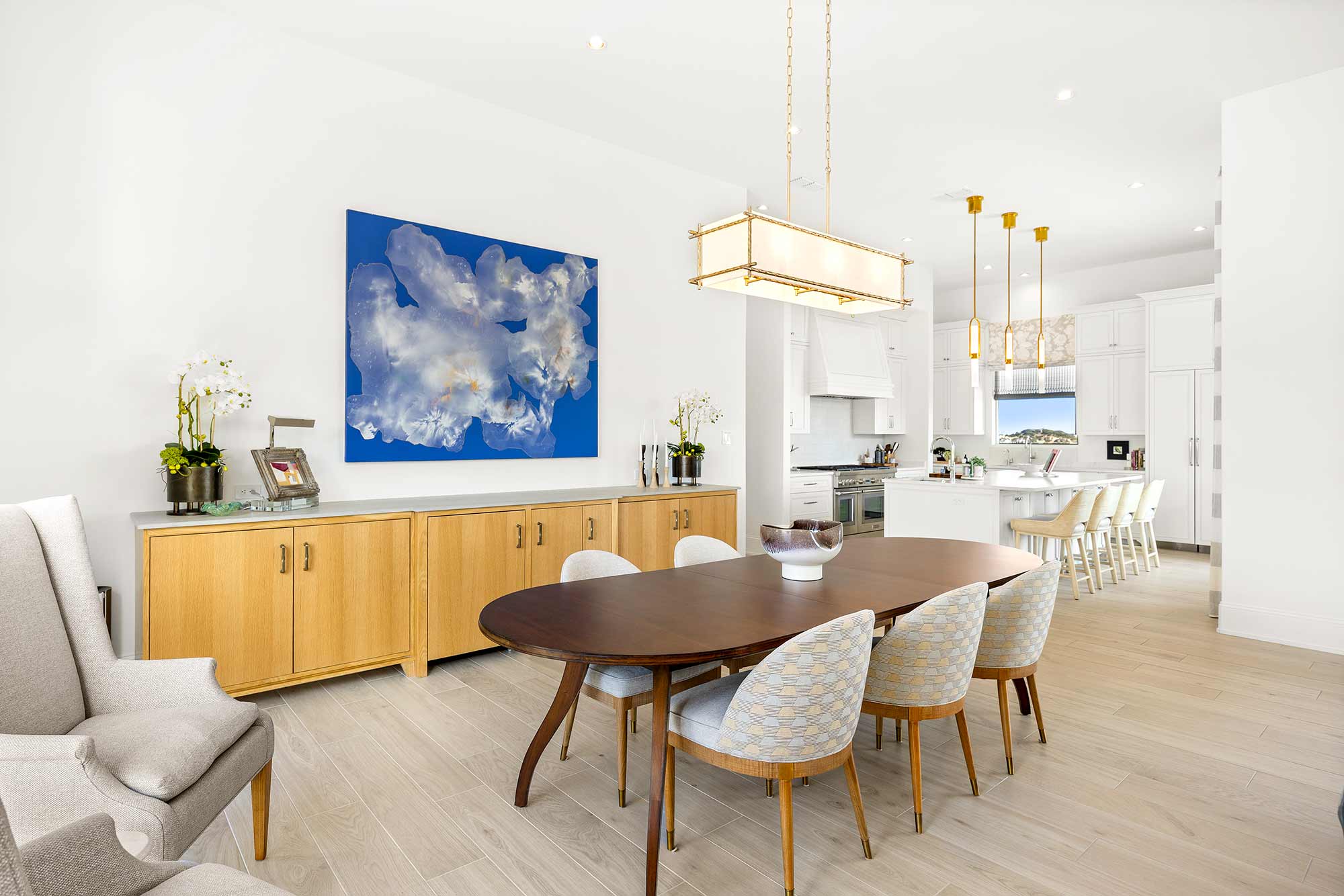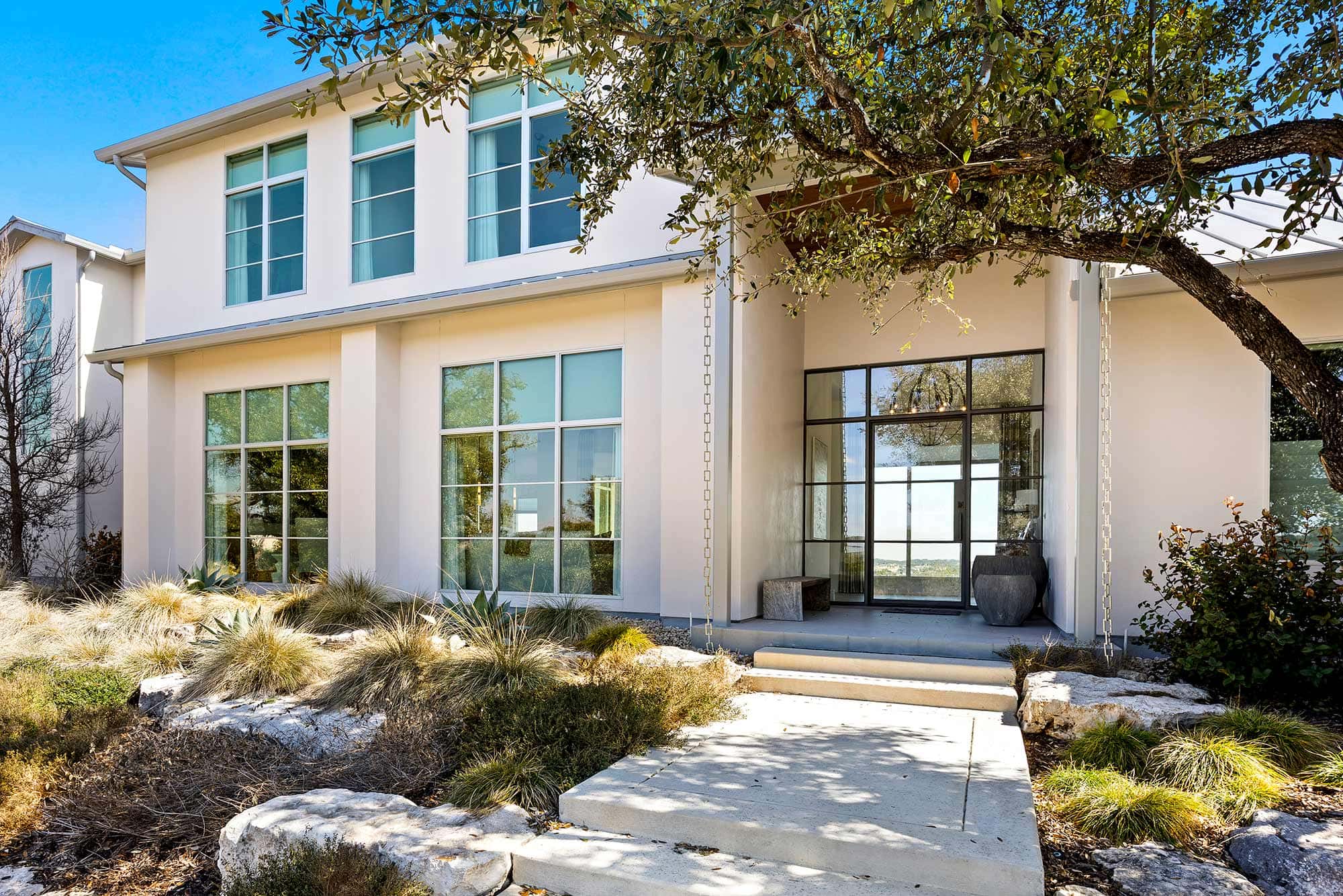 - Bright open spaces enhanced by light wall treatments, light wood floors and oversized windows