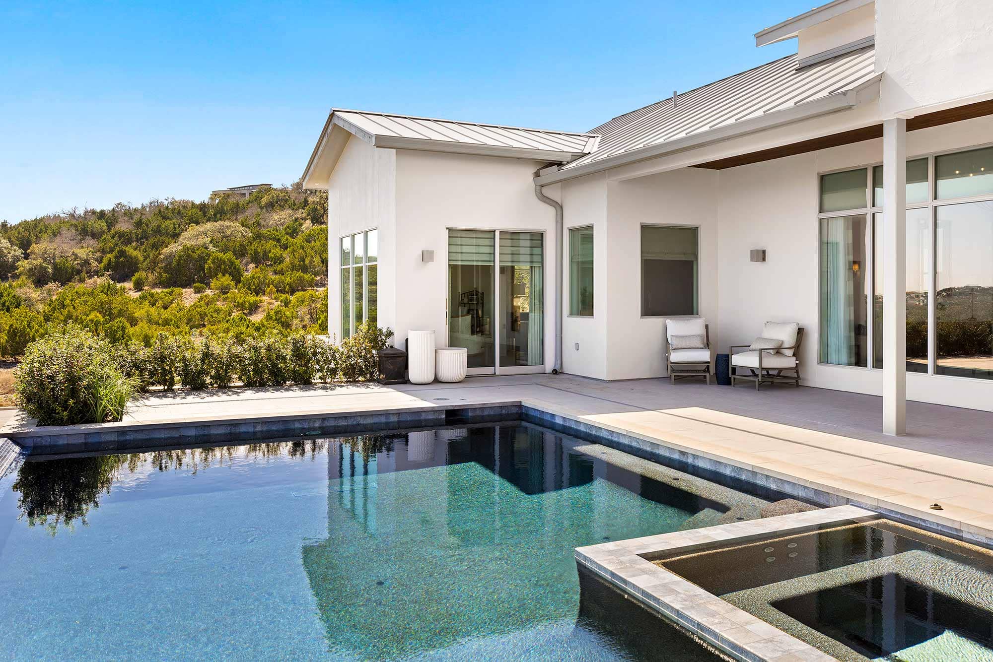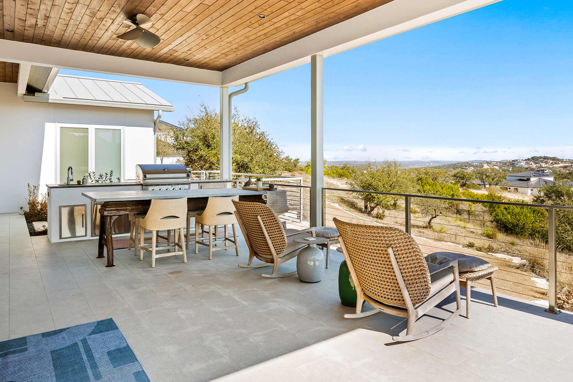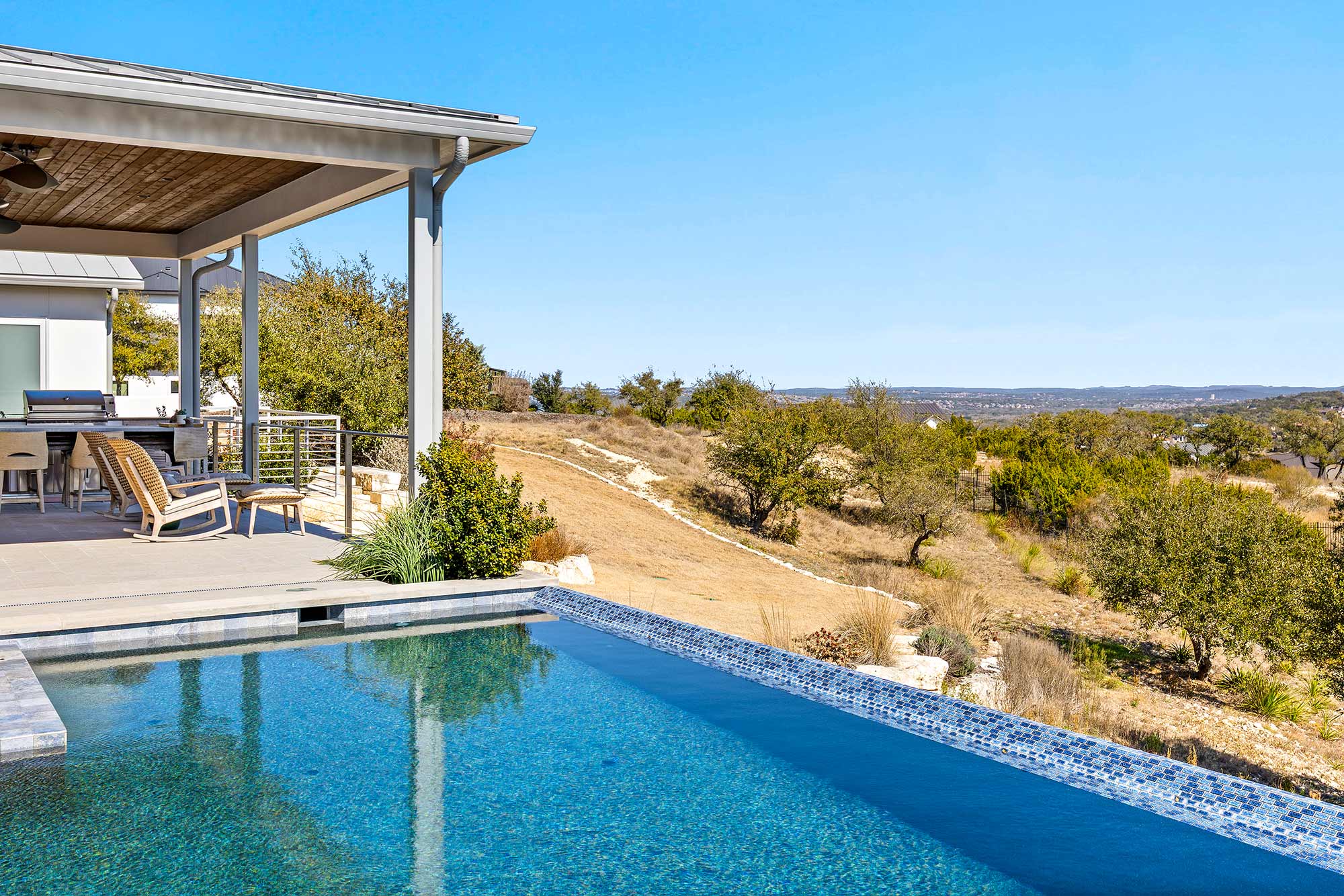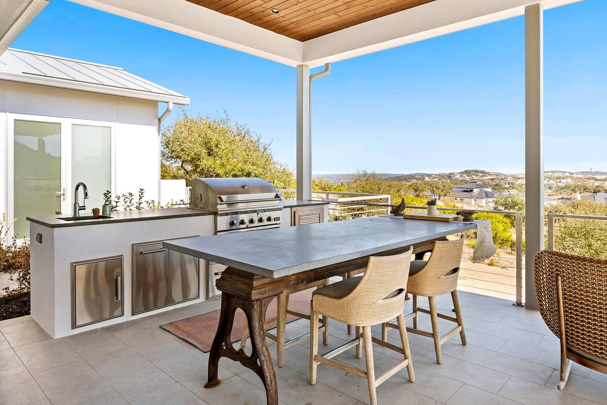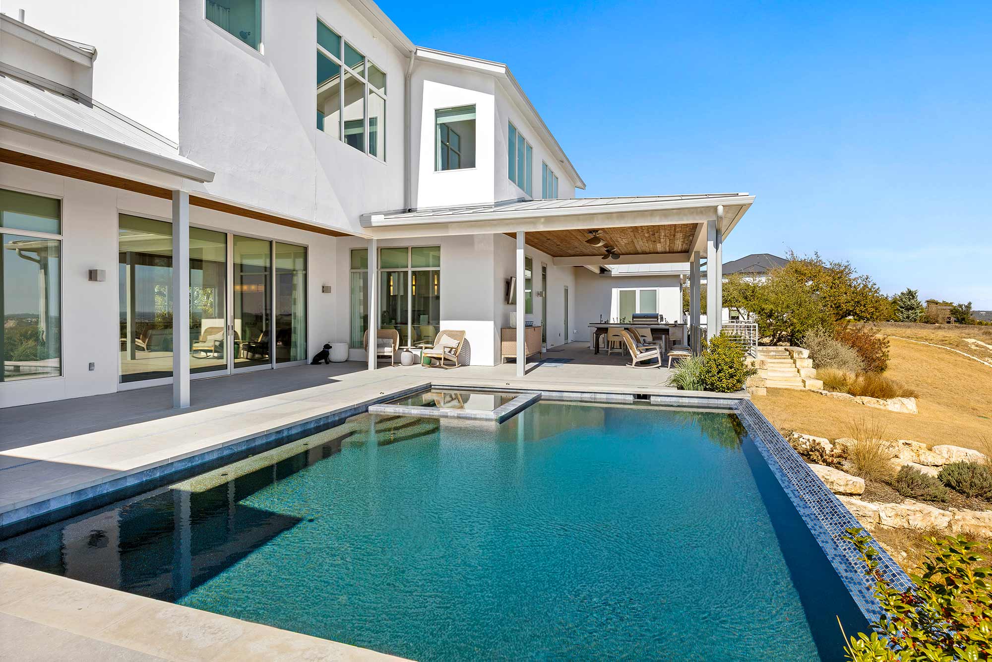 - Ample outdoor living space with covered outdoor kitchen, dining area and living area.